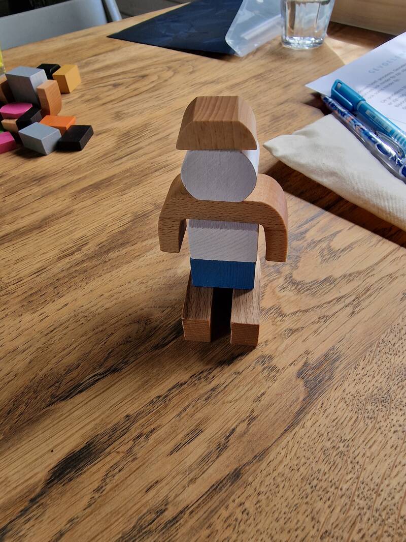 “Ik kies blauwe blokken omdat dat de kleur is van water en past bij de tranen, ik kies wit omdat ik dan moet denken aan de glinstering die tranen hebben. Op zijn hoofd een bruin blokje, als je verdrietig bent voel je je niet lekker in je hoofd”.
